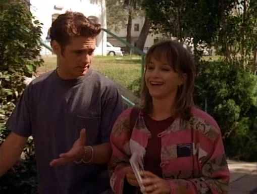 Brandon met Emily Valentine at the start of his junior year.[1] On Emily's first day and she runs into, and makes dates with, both Brandon and Dylan. Brandon and Emily soon start dating; their first kiss was at the Peach Pit on Halloween. Emily convinces the gang to visit an underground club where she takes U4EA and spikes Brandon's drink with the same drug. Afterwords, Brandon breaks up with Emily. She can't accept it an starts stalking Brandon, sending him cakes and making prank phone calls. After some bitter interactions, Emily douses a West Beverly homecoming float with flammable liquid. Brenda and Dylan arrive to the scene, and after seeing the lighter in Emily's hand, Brenda talks Emily down. It is soon revealed that Emily has been institutionalized, and Brandon visits her at Christmas.